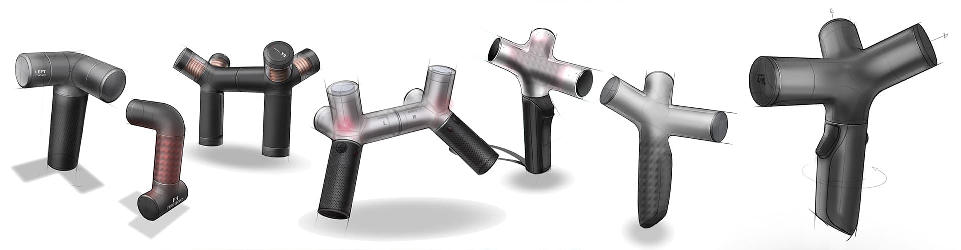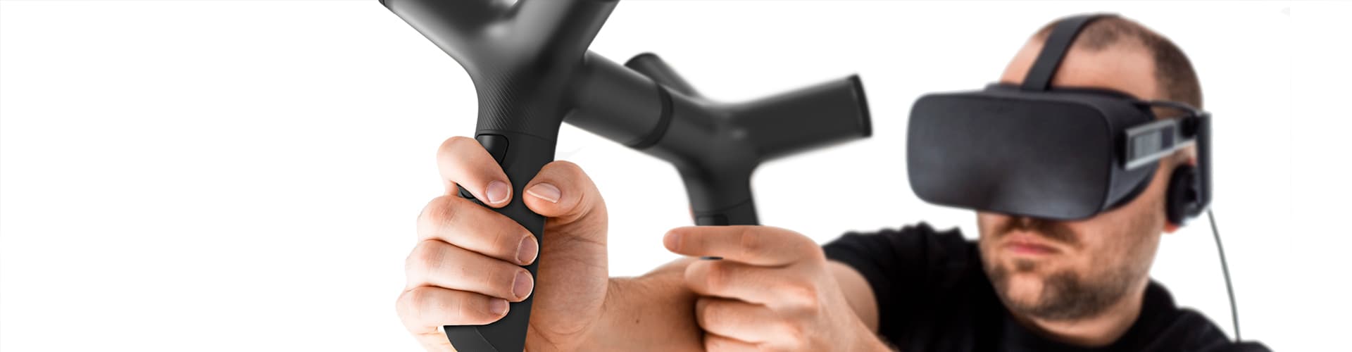 In addition to the far too monotonous feedback of existing controllers, another problem is that the player always has to hold the same object with his hands. The MRC controller solves this limitation in a playful way: With the aid of intensive grip studies, our design team has developed a sleek and branched form which can be combined in various ways to form new gripping scenarios. Because of the different holding combinations, the player can now, for the first time ever, have the actual feeling of holding different objects in his hands while looking through the VR glasses -- the steering wheel of a racing car or the spear of an ancient Greek warrior.
